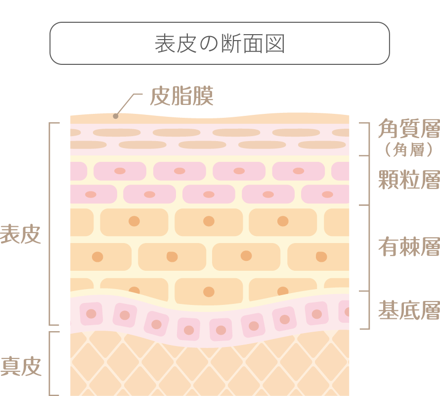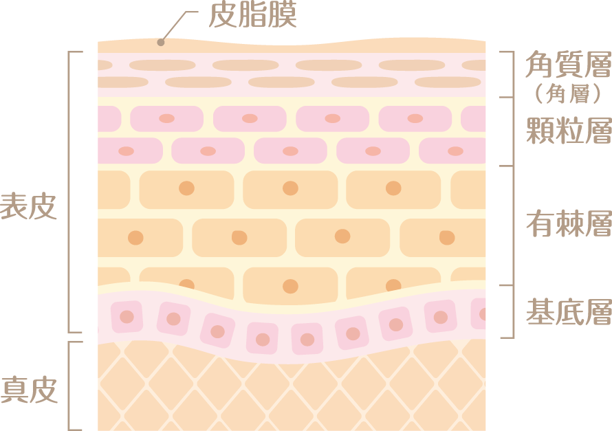 表皮の最下層部、真皮と接着している層です。1層の「基底細胞(きていさいぼう)」などから成る層で、日々新たに細胞が生み出されています。この基底層で作られた表皮細胞がターンオーバーに伴い角化して、肌バリアに重要な角層を形成します。