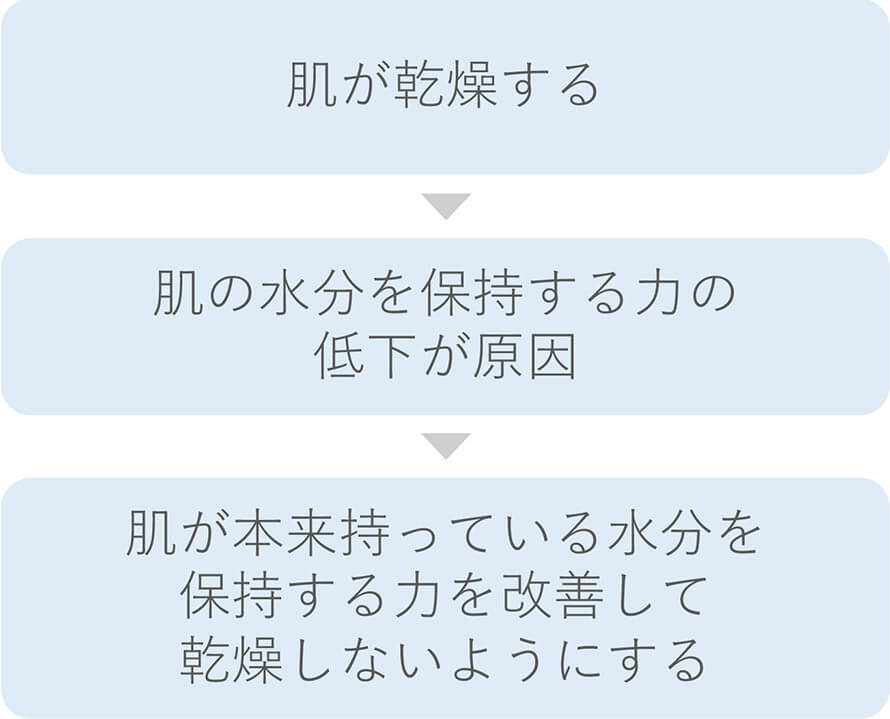 肌が乾燥する→水分量が足りない→保湿成分を肌に与えるといったアプローチではなく、